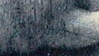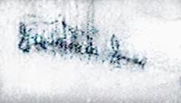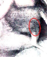A sinistra una immagine del "diavolo". All'interno dell'ovale possiamo notare la zona dove è celata la firma di Leonardo da Vinci. E' nascosta in quelle che sono le linee che formano il disegno. Nell'immagine successiva ho ingrandito quel tratto. Pur notando che si tratta di lettere in sequenza non si riesce a leggere nulla. E' necessario infatti leggere allo specchio questa grafia come tutti i manoscritti di Leonardo, che era mancino e scriveva da destra verso sinistra. Nell'immagine posta più sotto ho infatti "riflesso orizzontalmente" l'immagine al pc e nell'ultima l' ho infine ripulita digitalmente per isolare al meglio la grafia dallo sfondo. Anche se alcuni piccoli tratti si confondono con altre linee, e la qualità dell'immagine in mio possesso non è eccelsa, si può infatti notare, inequivocabilmente, la firma di Leonardo. |