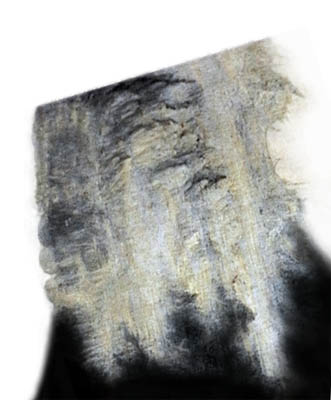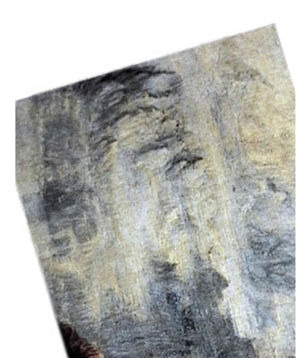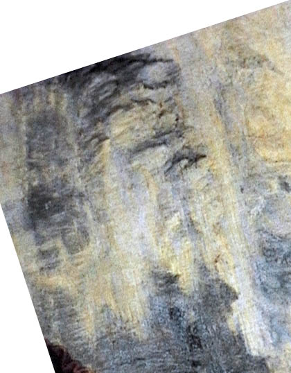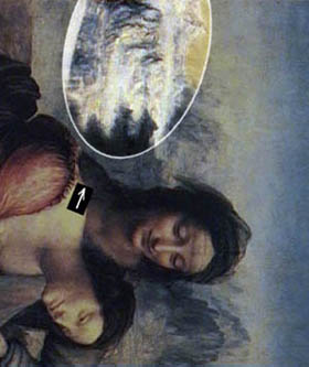| Observamos la imagen original girada en 90° en sentido horario de la obra de S. Ana. En la zona más alta está, oculto, el autorretrato de Leonardo da Vinci. Para observarlo de la mejor manera, se necesita girar ulteriormente la imagen 18°, en sentido antihorario. El rostro de Leonardo parece casi inclinarse transversalmente del margen del cuadro; no está completo. "Asomándose" deja la parte alta de la frente fuera del mismo cuadro. | ||||