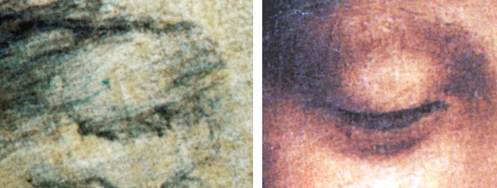 | En la imagen superior, a la izquierda, podemos notar el particular aumentado del ojo entrecerrado del autorretrato, comparado con el ojo de S. Ana (del mismo cuadro), para notar el "stile" habitual del artista. Se puede notar en el ojo del nuevo retrato los detalles particulares de las pestañas, de las cejas, los rasgos de diseño que forman el párpado, y aquellos que forman la sombra alta de la nariz. | ||||